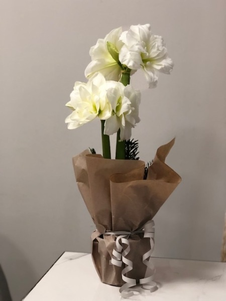 Valkoinen 3-vanainen kerrattukukallinen amaryllis. Koristeltu havuilla ja vahapaperilla #Joulu